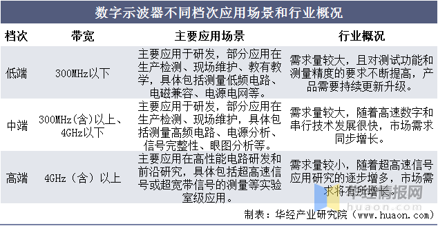 數(shù)字示波器按照核心指標帶寬從低到高變化時可分為低端產品、中端產品和高端產品。低端數(shù)字示波器帶寬頻率為300MHz以下,中端數(shù)字示波器帶寬在300MHz-4GHz區(qū)間,高端數(shù)字示波器帶寬在4GHz以上。不同檔次數(shù)字示波器劃分標準及對應不同的主要應用場景。