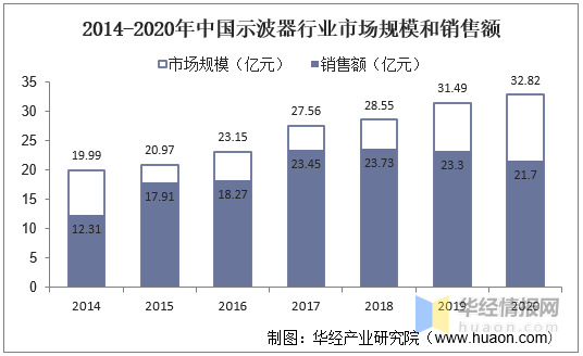 從市場規(guī)模和銷售額來看,國內中高端示波器產品滿足不了國內市場需求,需要進口國外高端產品。據(jù)統(tǒng)計,2020年中國示波器行業(yè)市場規(guī)模為32.82億元,銷售額為21.7億元。