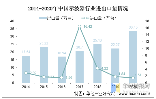 從進出口量來看,國內進口為國外高端產品來滿足國內需求,同時將國內中低端產能過剩的產品出口到國外。據(jù)統(tǒng)計,2020年中國示波器進口量為1.51萬臺,出口量為33.45萬臺,國內市場進口量逐步減少,出口量逐年增加。