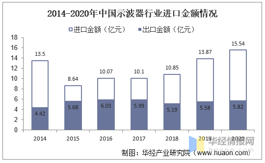 從進出口金額來看,據(jù)統(tǒng)計,2020年中國示波器行業(yè)進口額為5.82億元,出口額為15.54億元,進出口逆差為11.12億元,其中測試頻率在300MHz以下的通用示波器,于2019年已經實現(xiàn)進出口貿易順差,其他示波器進口金額較大。國內示波器產品在品牌效應上較海外產品存在差距。