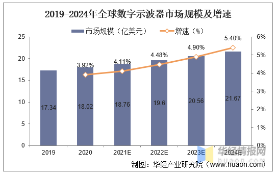 隨著電子工業(yè)的持續(xù)高速發(fā)展,信息技術產品的智能化、網(wǎng)絡化以及集成化程度逐步提高以及半導體、5G、人工智能、新能源、航天航空及國防等行業(yè)驅動,數(shù)字示波器具有良好的發(fā)展前景。數(shù)據(jù)顯示,數(shù)字示波器在2020的市場規(guī)模達到18.02億美元,在2024年將達到21.67億美元,2019年至2024的市場需求將按照4.56%的年均復合增長率增長。