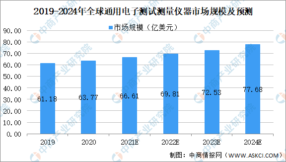隨著全球信息技術(shù)的發(fā)展、電子測量儀器應(yīng)用領(lǐng)域的不斷擴(kuò)大以及5G、半導(dǎo)體、人工智能、新能源、航空航天等行業(yè)驅(qū)動,全球通用電子測試測量儀器市場將持續(xù)穩(wěn)定增長。根據(jù)Technavio的數(shù)據(jù)顯示,2021年全球通用電子測試測量行業(yè)的市場規(guī)模為66.61億美元,預(yù)計在2024年市場規(guī)模達(dá)到77.68億美元,期間年均復(fù)合增長率將保持在4.89%。