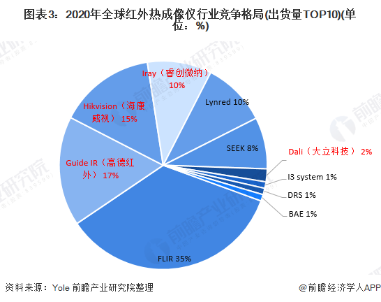 2021年2月, Yole發(fā)布最新版《2020年熱像儀和熱探測器報告》,報告數(shù)據(jù)顯示,在2020年的全球紅外熱成像整機出貨量上,美國FLIR市場占有率35%,排名第一,位居第二的是中國廠商高德紅外,市場占有率17%,同時也是市場占有率排名第一的中國熱成像廠商。全球十強中,中國廠商占據(jù)四席,分別是高德紅外、??低暋㈩?chuàng)微納和大立科技。