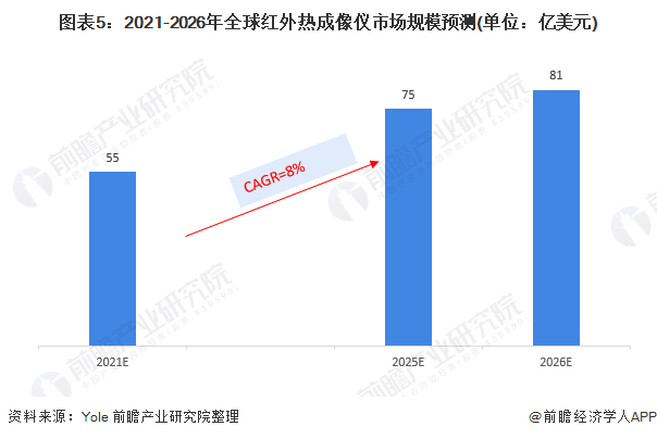 2020年新冠疫情使全球紅外熱成像市場規(guī)模激增,當(dāng)疫情逐步得到控制后,這用由特殊時期帶來的市場紅利將逐步衰弱,市場規(guī)模將有所下降,但仍高于疫情發(fā)生前。根據(jù)Yole發(fā)布的最新版《2020年熱像儀和熱探測器報告》,全球熱成像市場規(guī)模從2019年到2025年期間,將以8%的CAGR(年均復(fù)合增長率)增長,至2025年該市場價值可達約75億美元,若以此增速對2026年進行測算,2026年全球紅外熱成像儀市場規(guī)模約達81億美元。