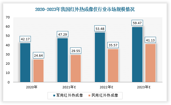 根據(jù)觀研報(bào)告網(wǎng)發(fā)布的《中國(guó)紅外熱像儀行業(yè)現(xiàn)狀深度研究與投資前景分析報(bào)告(2022-2029年)》顯示,目前,我國(guó)紅外熱像儀行業(yè)處于發(fā)展期,與國(guó)外成熟市場(chǎng)相比還有很大的增長(zhǎng)潛力。在經(jīng)濟(jì)持續(xù)發(fā)展、國(guó)家國(guó)防現(xiàn)代化行業(yè)支持政策及疫情影響下,我國(guó)市場(chǎng)對(duì)于紅外熱成像行業(yè)需求日趨旺盛。根據(jù)Maxtech International預(yù)測(cè),2023年,我國(guó)紅外熱像儀行業(yè)市場(chǎng)規(guī)模將達(dá)到100.60億美元,2020-2023年復(fù)合增長(zhǎng)率約為14.61%;其中,軍用紅外熱成像市場(chǎng)規(guī)模將達(dá)到59.47億美元,民用紅外熱成像市場(chǎng)規(guī)模將達(dá)到41.13億美元。