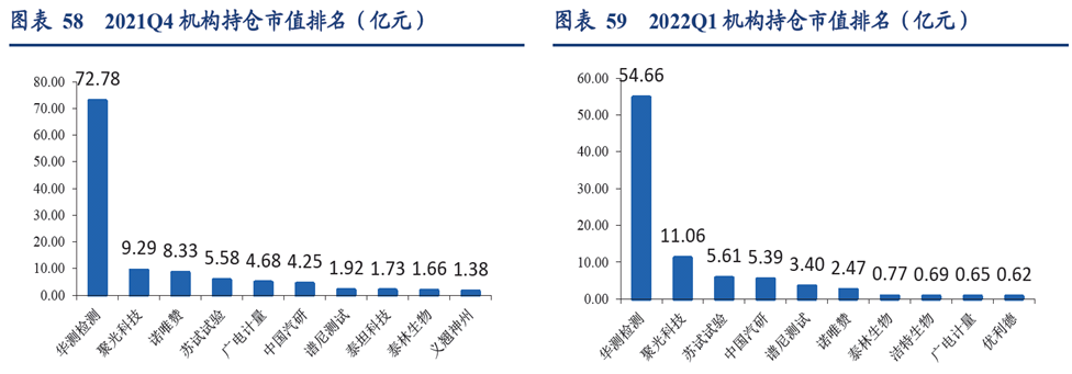對于科學(xué)服務(wù)這個板塊,很多投資者較為陌生,或許國內(nèi)公司質(zhì)地一般,被國外巨頭壟斷。其實,隨之我國科研的不斷投入,一些公司的技術(shù)在和國外縮小。國內(nèi)機構(gòu)對這些公司關(guān)一直較高,部分優(yōu)質(zhì)的公司還在積極加倉、例如聚光科技從去年Q4的9.29億到今年Q1的11.06億。機構(gòu)持倉市值前5 名為華測檢測、聚光科技、蘇試試驗、中國汽研和譜尼測試,與2021 年Q4 相比,蘇試試驗前進(jìn)1 位,整體持倉還是穩(wěn)定。