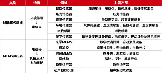 MEMS產(chǎn)品主要分為MEMS傳感器和MEMS執(zhí)行器兩大類。其中MEMS傳感器是用于探測和檢測物理、化學(xué)、生物等現(xiàn)象和信號的器件,而MEMS執(zhí)行器是用于實(shí)現(xiàn)機(jī)械運(yùn)動、力和扭矩等行為的器件。
