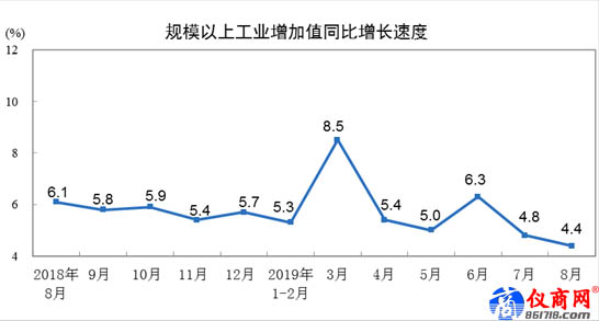 2019年8月份,規(guī)模以上工業(yè)增加值同比實(shí)際增長(zhǎng)4.4%(以下增加值增速均為扣除價(jià)格因素的實(shí)際增長(zhǎng)率),比7月份回落0.4個(gè)百分點(diǎn)。從環(huán)比看,8月份,規(guī)模以上工業(yè)增加值比上月增長(zhǎng)0.32%。1—8月份,規(guī)模以上工業(yè)增加值同比增長(zhǎng)5.6%。