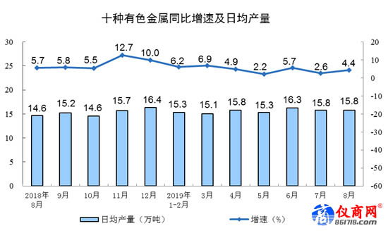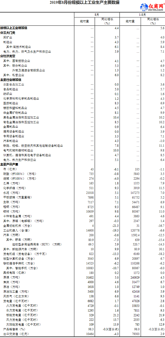 2019年1—8月份,全國(guó)規(guī)模以上工業(yè)增加值同比實(shí)際增長(zhǎng)5.6%,大體穩(wěn)定。其中,8月份增長(zhǎng)4.4%,增速較上月回落0.4個(gè)百分點(diǎn)。工業(yè)生產(chǎn)運(yùn)行的主要特點(diǎn):
