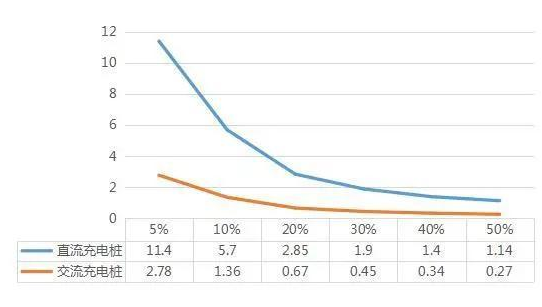 對于交流慢充樁來說,使用率為5%的情況下,回收期需要近3年,若提升使用率到30%(每天充電8小時(shí)),則投資回收期被縮短到半年以內(nèi)。這個(gè)情況對于直流快充樁表現(xiàn)更為明顯,在使用率為5%和30%的情況下,投資回收期分別為12年和2年。提升充電樁使用率將大幅度縮短充電樁的投資回收期。