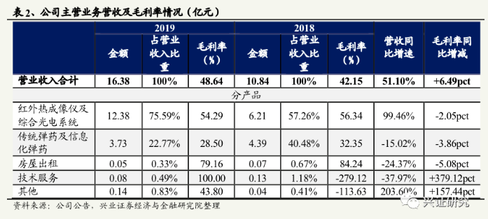 年報顯示,2019年,高德紅外紅外熱成像儀及綜合光電系統(tǒng)實現(xiàn)營業(yè)收入12.38億元,同比增長99.46%;傳統(tǒng)彈藥及信息化彈藥實現(xiàn)營業(yè)收入3.73億元,較上年有所下降。