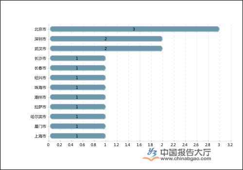 報告大廳對2020年中國儀器設(shè)備上市公司利潤規(guī)模排行榜(一季度)數(shù)據(jù)統(tǒng)計顯示,前16家利潤總額企業(yè)中,注冊地址在北京市的企業(yè)數(shù)量最多,共有3家企業(yè)上榜,占據(jù)了榜單總數(shù)的18.75%;注冊地址在深圳市的企業(yè)數(shù)量排在第二,共有2家企業(yè)上榜,其次是武漢市、長沙市等地區(qū),分別有2家、1家。