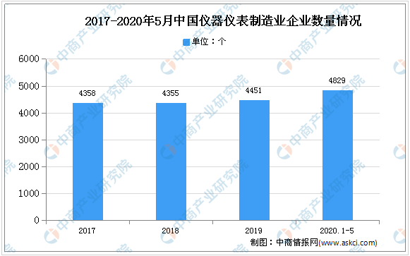 自2011年以來,我國儀器儀表制造業(yè)企業(yè)單位數(shù)呈遞增趨勢,該趨勢與我國儀器儀表行業(yè)的收入規(guī)模變化趨勢基本相同。據(jù)數(shù)據(jù)顯示,2020年1-5月我國儀器儀表制造業(yè)企業(yè)數(shù)量為4829個,同比增長8.64%。