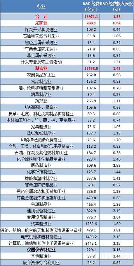 日前,國家統(tǒng)計局、科學(xué)技術(shù)部和財政部聯(lián)合發(fā)布了《2019年全國科技經(jīng)費投入統(tǒng)計公報》。報告顯示,2019年規(guī)模以上工業(yè)企業(yè)中,儀器儀表制造業(yè)投入研究與試驗發(fā)展經(jīng)費229.1億元,經(jīng)費投入強度3.16%,為行業(yè)第二,僅次于鐵路、船舶、航空航天和其他運輸設(shè)備制造業(yè)。