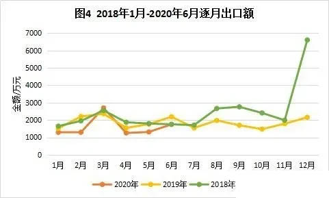 可以看出,2018年1月至2020年6月,坐標(biāo)測量機(jī)的進(jìn)口額和出口額均呈現(xiàn)逐漸降低的趨勢。從圖1和圖4可以看到,2018年的12月,不論是進(jìn)口額還是出口額,均出現(xiàn)了“井噴式”增長現(xiàn)象;2019年的12月,進(jìn)口額和出口額也較前幾個月有所升高。