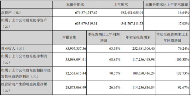 此外,森霸傳感第三季度營(yíng)業(yè)收入為8590.74萬(wàn)元,同比增長(zhǎng)63.53%;歸屬于上市公司股東的凈利潤(rùn)為3509.81萬(wàn)元,同比增長(zhǎng)68.85%;歸屬于上市公司股東的扣除非經(jīng)常性損益的凈利潤(rùn)為3255.36萬(wàn)元,同比增長(zhǎng)70.56%;基本每股收益為0.29元。