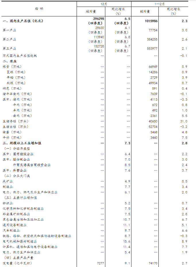 初步核算,全年國內(nèi)生產(chǎn)總值1015986億元,按可比價格計算,比上年增長2.3%。分季度看,一季度同比下降6.8%,二季度增長3.2%,三季度增長4.9%,四季度增長6.5%。分產(chǎn)業(yè)看,第一產(chǎn)業(yè)增加值77754億元,比上年增長3.0%;第二產(chǎn)業(yè)增加值384255億元,增長2.6%;第三產(chǎn)業(yè)增加值553977億元,增長2.1%。
