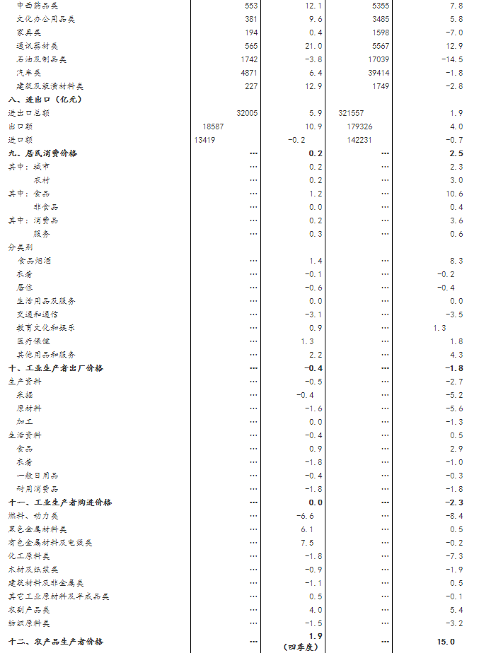 全年居民消費價格上漲2.5%,低于上年2.9%的漲幅,也低于3.5%左右的全年預(yù)期目標。其中,城市上漲2.3%,農(nóng)村上漲3.0%。分類別看,食品煙酒價格上漲8.3%,衣著下降0.2%,居住下降0.4%,生活用品及服務(wù)持平,交通和通信下降3.5%,教育文化和娛樂上漲1.3%,醫(yī)療保健上漲1.8%,其他用品和服務(wù)上漲4.3%。在食品煙酒價格中,糧食價格上漲1.2%,鮮菜價格上漲7.1%,豬肉價格上漲49.7%??鄢称泛湍茉磧r格的核心CPI上漲0.8%。12月份,居民消費價格同比上漲0.2%,環(huán)比上漲0.7%。全年工業(yè)生產(chǎn)者出廠價格比上年下降1.8%,12月份同比下降0.4%,環(huán)比上漲1.1%。全年工業(yè)生產(chǎn)者購進價格比上年下降2.3%,12月份同比持平,環(huán)比上漲1.5%。