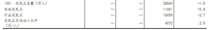 (7)農(nóng)民工是指戶籍仍在農(nóng)村,進城務(wù)工和在當?shù)鼗虍惖貜氖路寝r(nóng)產(chǎn)業(yè)勞動6個月及以上的勞動者。本地農(nóng)民工是指在戶籍所在鄉(xiāng)鎮(zhèn)地域內(nèi)從業(yè)的農(nóng)民工。外出農(nóng)民工是指在戶籍所在鄉(xiāng)鎮(zhèn)地域外從業(yè)的農(nóng)民工。