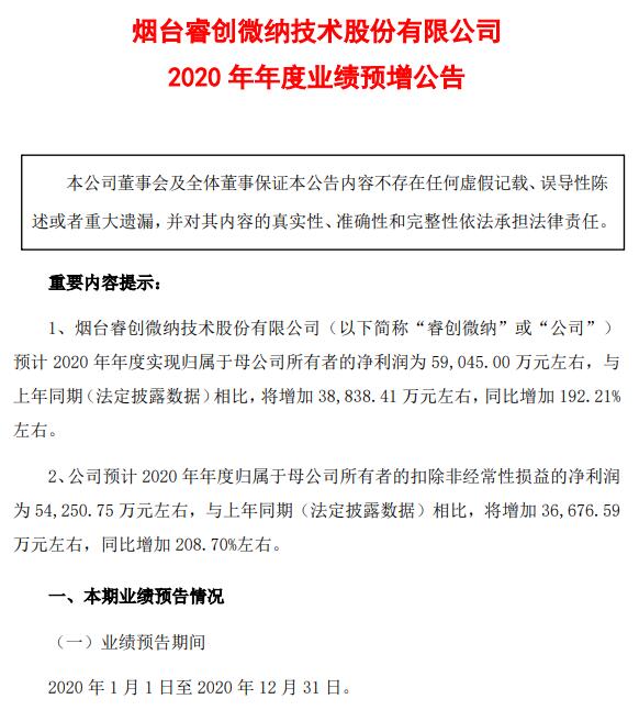 1月27日,睿創(chuàng)微納發(fā)布2020年年度業(yè)績預(yù)告:預(yù)計(jì)2020年年度實(shí)現(xiàn)歸屬于母公司所有者的凈利潤為5.9億元左右,與上年同期(法定披露數(shù)據(jù))相比,將增加38,838.41萬元左右,同比增加192.21%左右。
