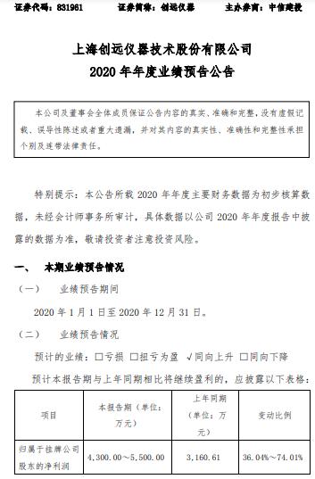 近日,新三板精選層公司創(chuàng)遠(yuǎn)儀器發(fā)布2020年業(yè)績(jī)預(yù)告,預(yù)計(jì)業(yè)績(jī)同向上升。創(chuàng)遠(yuǎn)儀器稱,經(jīng)初步核算,預(yù)計(jì)去年實(shí)現(xiàn)營(yíng)收3.02億元,同比增長(zhǎng)37.25%,歸屬于掛牌公司股東的凈利潤(rùn)為4300萬(wàn)至5500萬(wàn)元,同比2019年的3160.61萬(wàn)元增長(zhǎng)36.04%至74.01%。