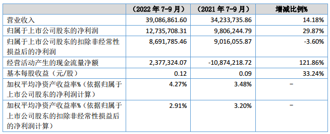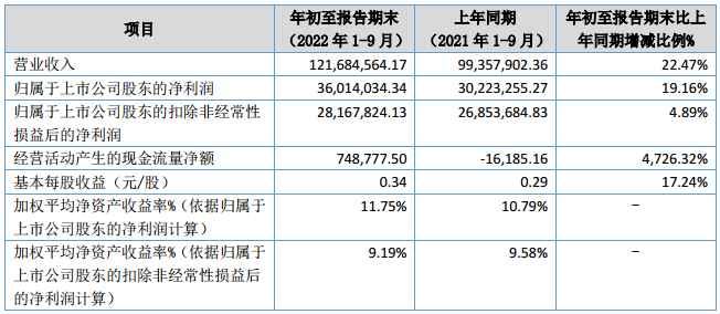 10月26日,北交所上市企業(yè)同惠電子發(fā)布2022年第三季度報(bào)告。公告顯示,同惠電子今年前三季度實(shí)現(xiàn)營(yíng)業(yè)收入1.22億元,同比增長(zhǎng)22.47%,凈利潤(rùn)3601.40萬(wàn)元,同比增長(zhǎng)19.16%,基本每股收益為0.34元。其中,今年第三季度實(shí)現(xiàn)營(yíng)業(yè)收入3909萬(wàn)元,同比增長(zhǎng)14.18%,凈利潤(rùn)為1274萬(wàn)元,同比增長(zhǎng)29.87%。