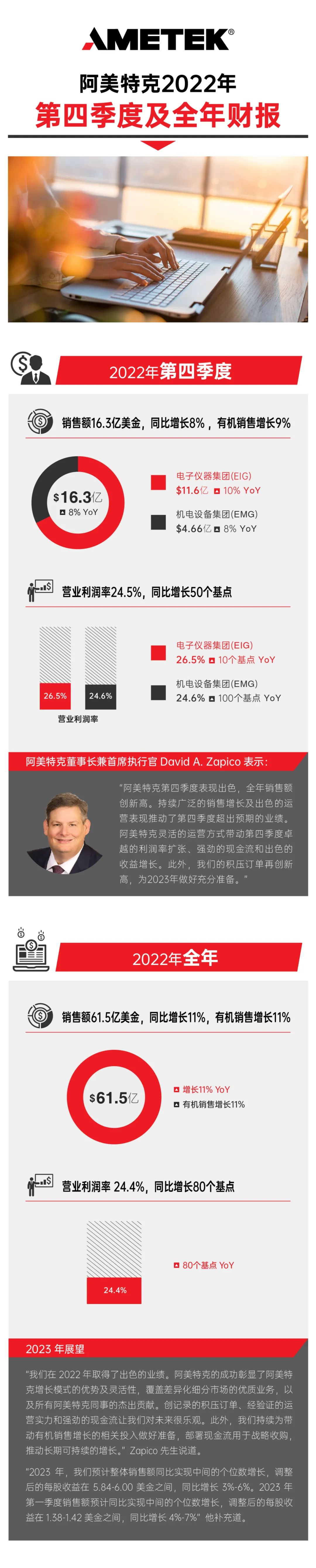 “阿美特克以出色的第四季度結(jié)束了創(chuàng)紀(jì)錄的2022年,”阿美特克董事長(zhǎng)兼首席執(zhí)行官David a.Zapico評(píng)論道?!拔覀?cè)诒炯径鹊臉I(yè)績(jī)超出了預(yù)期,持續(xù)的銷(xiāo)售增長(zhǎng)和出色的經(jīng)營(yíng)業(yè)績(jī)共同推動(dòng)了業(yè)績(jī)的上升。阿美特克經(jīng)營(yíng)的靈活性使我們?cè)诒炯径葘?shí)現(xiàn)了利潤(rùn)率顯著提升,現(xiàn)金流大幅增長(zhǎng)。此外,我們?cè)诮衲杲Y(jié)束時(shí)積壓了創(chuàng)紀(jì)錄的32億美元,為我們展望2023年做好了準(zhǔn)備?!?/span>