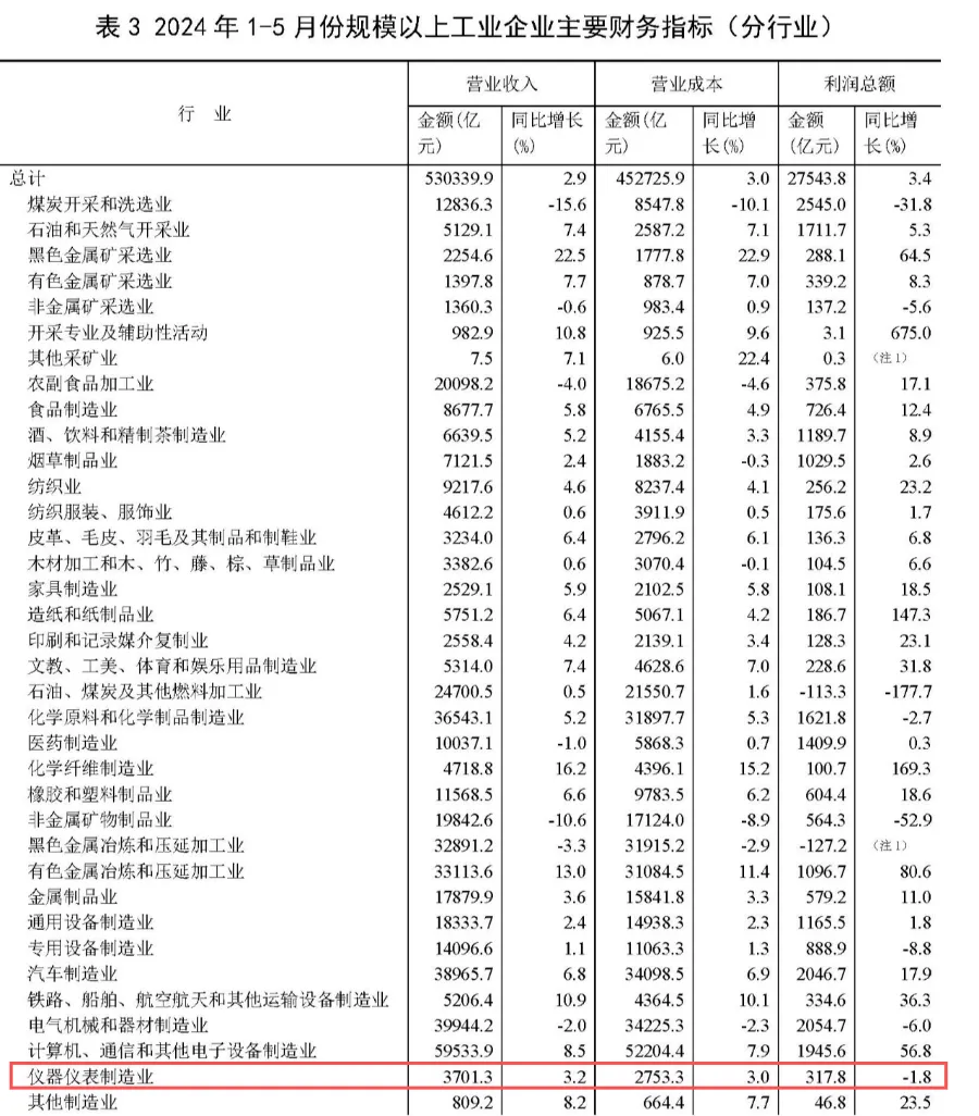 近日,國(guó)家統(tǒng)計(jì)局發(fā)布最新數(shù)據(jù),1—5月份,儀器儀表制造業(yè)營(yíng)業(yè)收入3701.3億元,同比增長(zhǎng)3.2%,實(shí)現(xiàn)利潤(rùn)總額317.8億元,同比下降1.8%。