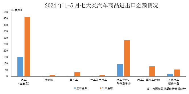 2024年1-5月,全國汽車商品累計進出口總額為1201.5億美元,同比增長6.4%。其中進口金額272.5億美元,同比下降8%;出口金額929億美元,同比增長11.6%。