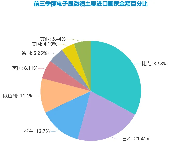 從典型產(chǎn)品看,前三季度,電子顯微鏡進(jìn)口13.8億美元,同比增長(zhǎng)47%,主要進(jìn)口來(lái)源國(guó)包括捷克、日本、荷蘭、以色列;捷克在金額上占據(jù)領(lǐng)先地位,總金額達(dá)4.54億美元,共進(jìn)口544臺(tái),均價(jià)為83.4萬(wàn)美元;日本在數(shù)量上領(lǐng)先,共進(jìn)口650臺(tái),總金額達(dá)2.96億美元,均價(jià)為45.6萬(wàn)美元,值得關(guān)注的是,進(jìn)口以色列、新加坡數(shù)量不多但單臺(tái)價(jià)值頗高,分別進(jìn)口44臺(tái)、8臺(tái),均價(jià)分別為349萬(wàn)美元、312萬(wàn)美元。從收貨地區(qū)看,廣東省、北京市、上海市、江蘇省、四川省和浙江省是主要的電子顯微鏡進(jìn)口地區(qū),總進(jìn)口額占比超80%。