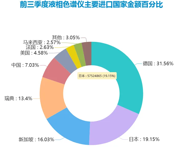 前三季度,液相色譜儀進(jìn)口共7655臺(tái),同比下降35%;進(jìn)口額3億美元,同比下降近40%;從進(jìn)口金額和數(shù)量看,德國(guó)作為安捷倫、賽默飛的主要主產(chǎn)地,其進(jìn)口數(shù)量和進(jìn)口金額占據(jù)第一地位,共進(jìn)口2485臺(tái),總金額達(dá)9481萬(wàn)美元,均價(jià)為3.8萬(wàn)美元;島津的主產(chǎn)地日本則位列第二,共進(jìn)口1734臺(tái),總金額達(dá)5752萬(wàn)美元,均價(jià)為3.3萬(wàn)美元;位列第三的是沃特世的主產(chǎn)地新加坡,共進(jìn)口1109臺(tái),總金額達(dá)4816萬(wàn)美元,均價(jià)為4.3萬(wàn)美元;瑞典、中國(guó)、美國(guó)、法國(guó)位列其后,其中進(jìn)口瑞典的臺(tái)均單價(jià)較高,均價(jià)為9.9萬(wàn)美元,而進(jìn)口美國(guó)的臺(tái)均單價(jià)較低,均價(jià)為1.85萬(wàn)美元,進(jìn)口法國(guó)的臺(tái)數(shù)僅10臺(tái),但單臺(tái)均價(jià)為78.8萬(wàn)美元。從收貨地區(qū)看,上海市、廣東省、北京市、江蘇省、浙江省、山東省和四川省是主要的液相色譜儀進(jìn)口地區(qū),總進(jìn)口額占比近85%。