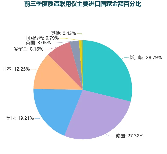 前三季度,質(zhì)譜聯(lián)用儀進(jìn)口2229臺(tái),同比下降近40%,進(jìn)口金額總計(jì)約4.7億美元,同比下降37.2%。從進(jìn)口來(lái)源地來(lái)看,新加坡、德國(guó)、美國(guó)、日本和愛(ài)爾蘭位居我國(guó)質(zhì)譜聯(lián)用儀進(jìn)口國(guó)的前五位,其中新加坡無(wú)論進(jìn)口金額還是進(jìn)口數(shù)量均牢牢占據(jù)首位,共進(jìn)口642臺(tái),總金額達(dá)1.35億美元,均價(jià)為21萬(wàn)美元;德國(guó)位居第二,共進(jìn)口233臺(tái),總金額達(dá)1.28億美元,均價(jià)為55萬(wàn)美元;進(jìn)口美國(guó)、日本的數(shù)量次于新加坡,但單臺(tái)價(jià)格相對(duì)較低,其中進(jìn)口美國(guó)634臺(tái),總金額達(dá)9023萬(wàn)美元,均價(jià)為14.2萬(wàn)美元,進(jìn)口日本471臺(tái),總金額達(dá)5756萬(wàn)美元,均價(jià)為12.2萬(wàn)美元;新加坡、德國(guó)、美國(guó)和日本四個(gè)國(guó)家就占據(jù)了我國(guó)進(jìn)口市場(chǎng)份額的85%以上。從國(guó)內(nèi)市場(chǎng)來(lái)看,上海市、廣東省和北京市是我國(guó)進(jìn)口質(zhì)譜聯(lián)用儀的核心市場(chǎng)集群,三者合計(jì)的進(jìn)口金額占比約65%,緊隨其后的是江蘇省、浙江省、山東省、四川省。