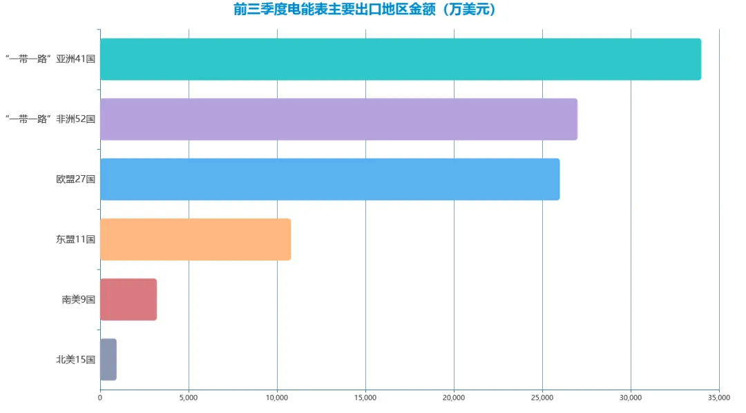 作為出口優(yōu)勢(shì)的典型代表性產(chǎn)品,電能表前三季度出口11.5億美元,同比增幅超過(guò)10%。出口“一帶一路”亞洲41國(guó)約3.4億美元,其中孟加拉國(guó)、沙特阿拉伯、巴基斯坦、約旦、馬來(lái)西亞、菲律賓、泰國(guó)是主要出口地區(qū);出口“一帶一路”非洲52國(guó)約2.7億美元,其中加納、利比亞、肯尼亞、科特迪瓦、埃塞俄比亞、南非是主要出口地區(qū);出口歐盟27國(guó)約2.6億美元,其中德國(guó)、意大利、荷蘭、波蘭、希臘、葡萄牙、瑞典是主要出口地區(qū);出口東盟11國(guó)約1.1億美元,其中馬來(lái)西亞、菲律賓、泰國(guó)、越南、新加坡是主要出口地區(qū)。除此以外,南美洲的阿根廷、秘魯、智利,北美洲的巴拿馬等國(guó)家也有少量出口份額。從電能表發(fā)貨地區(qū)看,浙江省、廣東省、四川省位列前三,其電能表出口份額超70%,湖南省、江蘇省、上海市則位列其后。