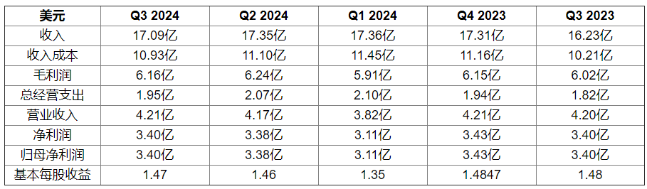 2024財(cái)年前三財(cái)季累計(jì)凈利潤(rùn)9.89億美元,去年同期累計(jì)凈利潤(rùn)為9.70億美元,同比增長(zhǎng)1.91%。