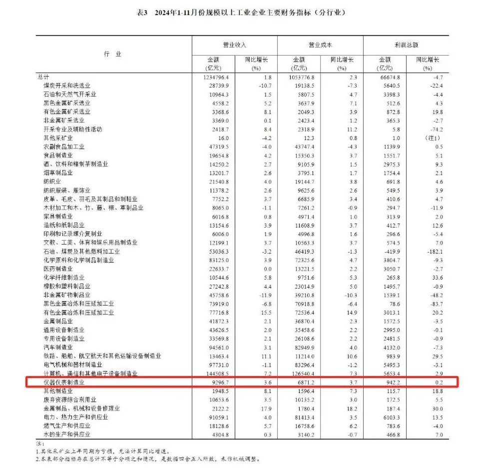 12月27日,國(guó)家統(tǒng)計(jì)局公布了2024年1-11月份全國(guó)規(guī)模以上工業(yè)企業(yè)實(shí)現(xiàn)利潤(rùn)總額增長(zhǎng)狀況。1-11月份,全國(guó)規(guī)模以上工業(yè)企業(yè)實(shí)現(xiàn)利潤(rùn)總額66674.8億元,同比下降4.7%。其中,1-11月份全國(guó)規(guī)模以上儀器儀表制造企業(yè)實(shí)現(xiàn)利潤(rùn)總額942.2億元,同比增長(zhǎng)0.2%。