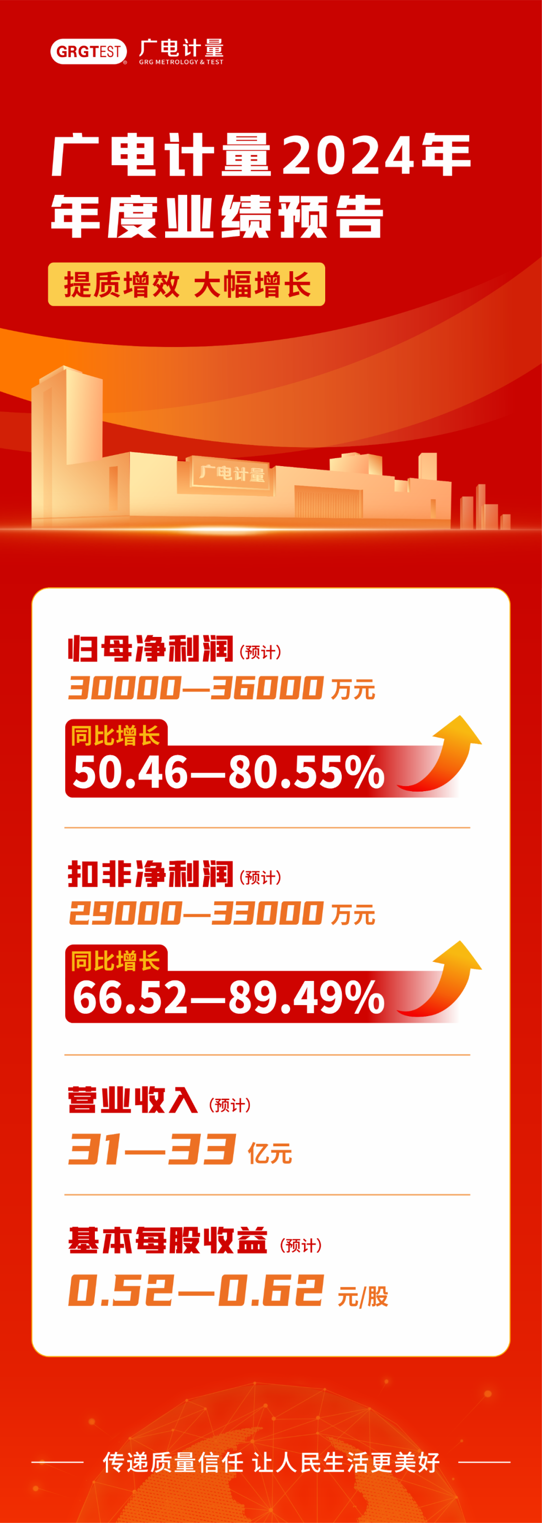 廣電計量1月14日晚間公告,預(yù)計2024年歸屬于上市公司股東的凈利潤為3億元-3.6億元,比上年同期增長50.46%-80.55%,扣非凈利潤2.9億元-3.3億元,比上年同期增長66.52%-89.49%,營業(yè)收入31億元-33億元。