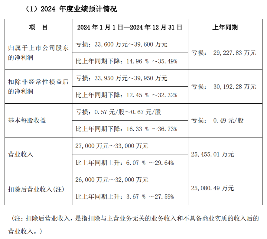 近日,大立科技披露2024年度業(yè)績(jī)預(yù)告,預(yù)計(jì)2024年度歸屬于上市公司股東的凈利潤(rùn)虧損3.36億元~3.96億元,比上年同期下降14.96% ~ 35.49%。扣除非經(jīng)常性損益后的凈利潤(rùn)虧損3.395億元~3.995億元,比上年同期下降12.45% ~ 32.32%。基本每股收益虧損0.57元/股~0.67元/股,比上年同期下降16.33% ~ 36.73%。營(yíng)業(yè)收入預(yù)計(jì)2.7億元~3.3億元,比上年同期上升6.07% ~ 29.64%。扣除后營(yíng)業(yè)收入預(yù)計(jì)2.6億元~3.2億元,比上年同期上升3.67% ~ 27.59%。