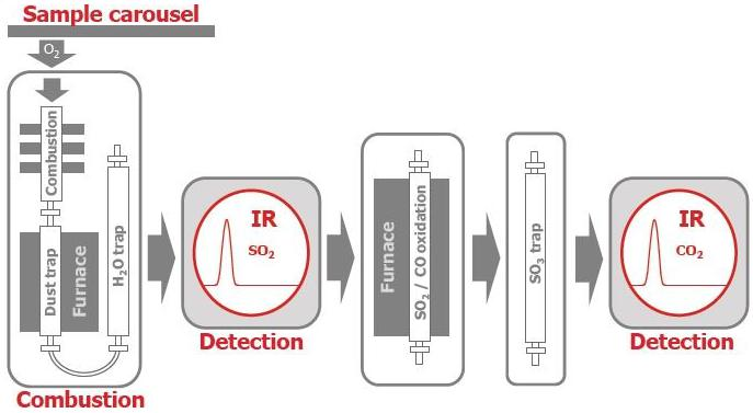 燃燒:樣品首先被加熱至高溫,通常是在氧氣或純氧氣環(huán)境中進行。氣體釋放:高溫下,樣品中的碳和硫會被釋放為二氧化碳和二氧化硫