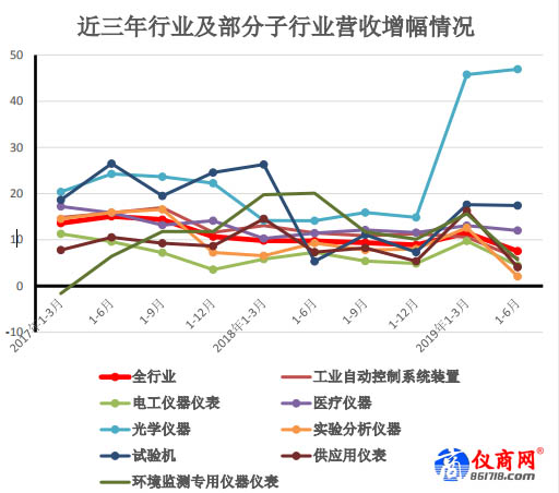 國(guó)統(tǒng)局?jǐn)?shù)據(jù)顯示,2019年上半年儀器儀表大行業(yè)規(guī)模以上企業(yè)4927個(gè),營(yíng)收規(guī)模4002億元,營(yíng)收同比7.57%;利潤(rùn)總額為361億元,同比增長(zhǎng) 2.87%,比主營(yíng)收入低4.70個(gè)百分點(diǎn);期間費(fèi)用中,財(cái)務(wù)費(fèi)用同比 19.53%增幅較高,利息同比23.20%;負(fù)債總計(jì)同比10.15%;管理費(fèi)用同比增幅0.26%;應(yīng)收賬款同比增長(zhǎng)7.73%,資產(chǎn)負(fù)債率為45.50%,高于去年同期1.96個(gè)百分點(diǎn)。根據(jù)海關(guān)統(tǒng)計(jì)2019年1-6月進(jìn)口總額246.6億美元,出口總額150.9億美元。進(jìn)出口逆差達(dá)95.7億美元,比去年同期下降13%。