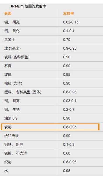 物體的發(fā)射率跟物體材料本身的性質(zhì)有關(guān),ε=0.5代表物體發(fā)射的輻射50%來自于自身發(fā)射的輻射能量,其他50%來自于透射和反射。常見物體的發(fā)射率可以參考以下對紅外測溫儀進行參數(shù)的設(shè)定,當(dāng)你需要測量什么類型的物體,即可將紅外測溫儀的參數(shù)調(diào)整至對應(yīng)的發(fā)射率。這樣測得的結(jié)果是物體真實的溫度,否則將可能會有較大的偏差。食品行業(yè)使用的紅外測量設(shè)備,發(fā)射率可以調(diào)整至0.8-0.95。