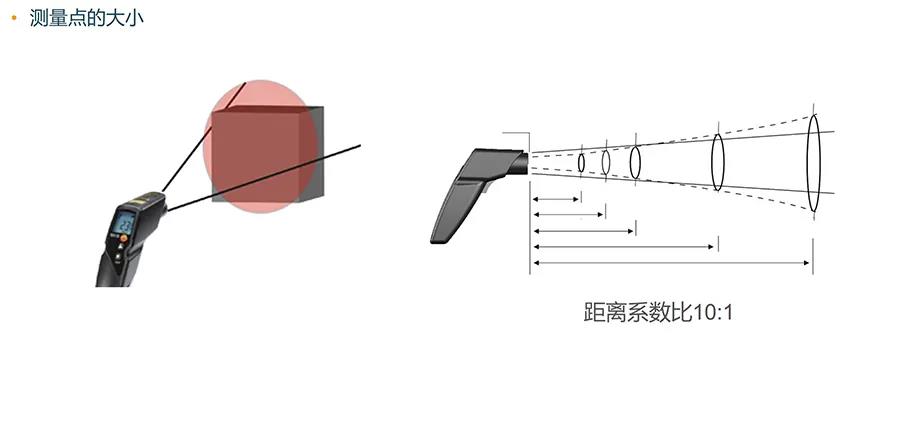 第四是測量物體的大小,如圖,紅外測量設(shè)備有一個參數(shù)稱為距離系數(shù)比,如830T1的距離系數(shù)比為10:1,這表示測量的距離與被測物體表面的圓形范圍直徑的比為10:1,當(dāng)距離被測物體表面的距離是10厘米時,測得是被測物體表面1厘米直徑內(nèi)的平均溫度。這將影響測量的結(jié)果,如果距離過遠,可能測量的圓形范圍超過了物體實際的大小,則測量結(jié)果不是待測物體的真正的表面溫度。