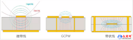 如圖1中場(chǎng)力線分布,微帶線與GCPW的信號(hào)傳播方向上并不存在場(chǎng)分量。但由于這兩種傳輸線的電、磁場(chǎng)并不完全分分布于電介質(zhì)中,有少部分場(chǎng)力線位于空氣中;導(dǎo)致信號(hào)在電介質(zhì)中與空氣中傳輸?shù)腡EM波的相速不同,其分界面并不能完全實(shí)現(xiàn)相位匹配。因此這兩種傳輸線模式是準(zhǔn)TEM波模式。而帶狀線的場(chǎng)力線上下對(duì)稱分布于中間層介質(zhì)中,因此帶狀線的傳輸模式是TEM波模式。