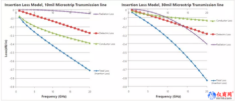 對(duì)于PCB傳輸線電路,插入損耗主要包括介質(zhì)損耗、導(dǎo)體損耗、輻射損耗和泄露損耗幾個(gè)部分,是各種損耗成分的總和。泄漏損耗通常是由于信號(hào)與地之間形成了泄漏電流而導(dǎo)致的能量的損失。由于高頻PCB材料具有較大的體電阻,泄露損耗很小,一般可以忽略。電路的導(dǎo)體損耗是傳輸線上信號(hào)路徑的能量損失,是由導(dǎo)體自身的阻抗引起。介質(zhì)損耗則是由構(gòu)成電路的電路材料的耗散因子所決定,選擇相對(duì)較小的損耗因子材料有利于電路總的插入損耗的減小。