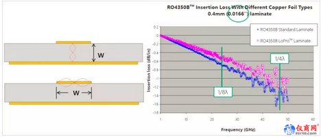 電路材料厚度的降低對(duì)輻射損耗的減小,也可以看作是減小了電路中寄生雜散模式的產(chǎn)生。電路中所傳輸?shù)男盘?hào)往往包含多個(gè)頻率分量。由微波電路理論知道,當(dāng)電路的厚度或?qū)挾却笥趥鬏斝盘?hào)的1/8波長(zhǎng)時(shí),電路將產(chǎn)生雜散模。如圖4所示,當(dāng)使用的電路材料較厚,設(shè)計(jì)同一阻抗如50Ω線路也會(huì)較寬,如果這一厚度或?qū)挾扰c所傳輸信號(hào)中的波長(zhǎng)相比擬時(shí),電路的性能就將被惡化。以16.6mil RO4350BTM材料設(shè)計(jì)的50Ω微帶線為例,此時(shí)微帶線的寬度是36mil。這一寬度對(duì)應(yīng)的1/4波長(zhǎng)的頻率是46.5GHz,而對(duì)應(yīng)的1/8波長(zhǎng)的頻率是23.8GHz。因此這一電路在高頻段如46.5GHz時(shí)性能較差,而在小于23.8GHz時(shí)的波動(dòng)較小、性能較好。