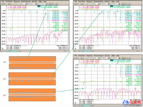 GCPW的信號(hào)饋入的優(yōu)化設(shè)計(jì)與微帶線基本相同。但由于GCPW的結(jié)構(gòu)與微帶線結(jié)構(gòu)不同,GCPW兩側(cè)地平面過(guò)孔位置對(duì)其性能也存在顯著影響。選取Rogers的RO4350BTM材料設(shè)計(jì)不同GCPW傳輸線,如圖7所示。電路均采用相同的信號(hào)饋入設(shè)計(jì),不同之處在于接地過(guò)孔的位置與間隔。從實(shí)際電路的測(cè)試看到,三個(gè)不同電路饋入點(diǎn)阻抗測(cè)試基本一致,具有較好的饋入點(diǎn)設(shè)計(jì)??梢钥吹?3電路具有很好的插入損耗特性和回波特性,電路帶寬能夠達(dá)到40GHz以上。而對(duì)于#1號(hào)電路,由于接地過(guò)孔位置與線路相隔較遠(yuǎn),延長(zhǎng)了信號(hào)回路路徑,使在信號(hào)回路中產(chǎn)生了寄生的電感或電容,從而導(dǎo)致性能惡化,電路帶寬只有約30GHz。而#2號(hào)電路的接地過(guò)孔位置相同,但減少了過(guò)孔的數(shù)量,導(dǎo)致兩個(gè)相鄰過(guò)孔之間并沒(méi)有形成良好的電壁而產(chǎn)生強(qiáng)反射;#2號(hào)電路的回波損耗和插入損耗帶寬僅有約13GHz。因此GCPW的接地過(guò)孔設(shè)計(jì)也是影響其性能的關(guān)鍵因素。通常,過(guò)孔的位置應(yīng)盡量靠近線路,過(guò)孔的間距不得大于最高工作頻率的1/4波長(zhǎng)。