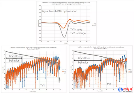 圖9 不同饋入信號(hào)過(guò)孔設(shè)計(jì)的帶狀線性能比較