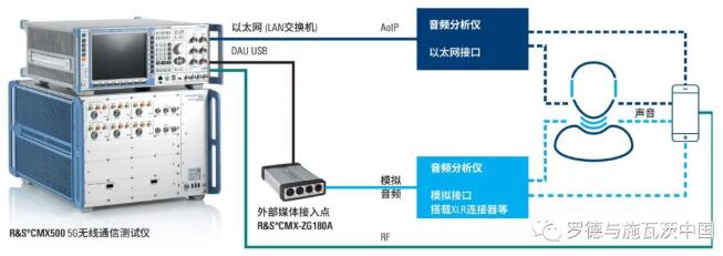 通話過(guò)程中需要使用音頻分析儀來(lái)測(cè)試音頻質(zhì)量。該分析儀必須能夠使用最新的PESQ®或POLQA®方法來(lái)生成和分析音頻波形。POLQA®用于在VoNR和VoLTE通話期間進(jìn)行音頻質(zhì)量測(cè)量。R&S的CMW500和CMX500設(shè)備可以進(jìn)行擴(kuò)展,以納入音頻分析儀,如下圖所示??梢酝ㄟ^(guò)兩種方式連接音頻分析儀。音頻數(shù)據(jù)可以通過(guò)IP輸出,或者如果首選模擬音頻分析儀,也可通過(guò)外部CMX-ZG180A媒體接入點(diǎn)輸出。用戶可以根據(jù)自身需求,十分靈活地選擇優(yōu)先使用的音頻分析儀。