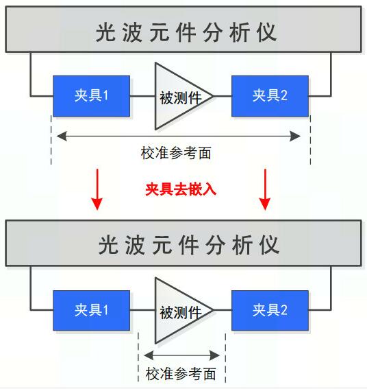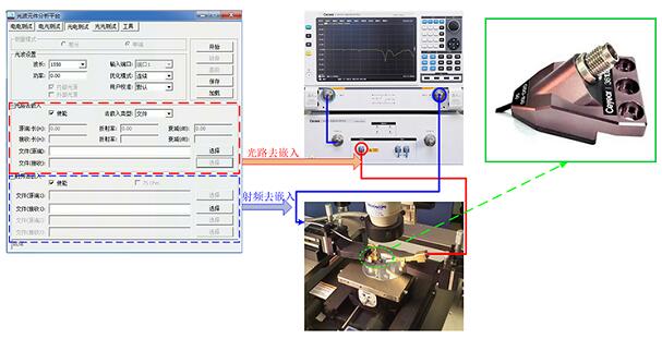 (三)解決問題的具體方法:以PD芯片為例,基于自動(dòng)夾具移除的光芯片測(cè)試連接如示意圖所示,輸出的光信號(hào)通過光纖跳線連接到被測(cè)芯片的輸入端,被測(cè)芯片輸出的電信號(hào)通過射頻電纜連接到儀器的射頻端口2。在測(cè)試時(shí),首先通過自動(dòng)夾具移除功能得到高頻探針的s2p文件,其次通過射頻去嵌入消除探針帶來的測(cè)量誤差,以獲得被測(cè)芯片的真實(shí)S參數(shù)。