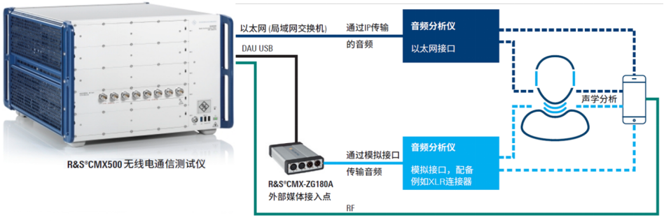 在開始測試時,DUT的揚(yáng)聲器和麥克風(fēng)連接到音頻分析儀。R&S®CMX500支持內(nèi)部IMS服務(wù)器,通過采用虛擬UE仿真和音頻環(huán)回模式,從而可實(shí)現(xiàn)快速簡單的VoNR功能測試。R&S®CMX500提供兩個接口連接外部音頻測試儀。一種方法是通過以太網(wǎng)將數(shù)字RTP音頻信號輸出到外部數(shù)字音頻分析儀 (IP轉(zhuǎn)發(fā)模式)。第二種測試方法使用R&S®CMX-ZG180A外部媒體接入點(diǎn)通過模擬接口來連接外部音頻測試儀(例如R&S®UPV音頻分析儀等)。