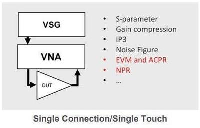 因此,是德科技開發(fā)了一種新的測量方法(調(diào)制失真)來執(zhí)行 PA 表征,以應(yīng)對傳統(tǒng)方法的挑戰(zhàn)。這種方法利用高動態(tài)范圍和最低殘余 EVM 來快速測量非常低的EVM。調(diào)制失真測試設(shè)置使用 VNA 和信號發(fā)生器在單個測試系統(tǒng)中提供所有 VNA 測量參數(shù)如S參數(shù)、器件的殘余EVM,輸出EVM,EVM vs power,ACPR,NPR,DPD,load pull等測量。